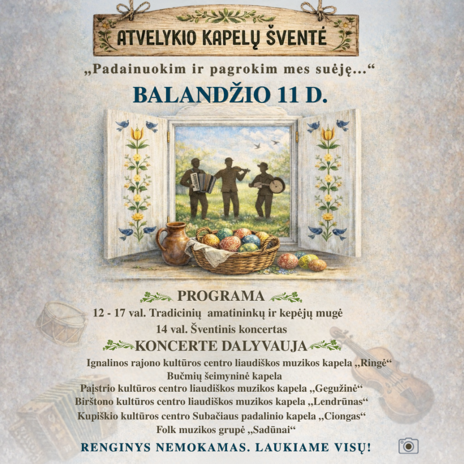 Pavasaris jau čia, o kartu su juo – ir graži Atvelykio šventė, suburianti bendruomenę smagiam laikui kartu! Kviečiame visus atvykti pasidžiaugti gyva liaudiška muzika, jaukia atmosfera ir tikra lietuviška šventės nuotaika.